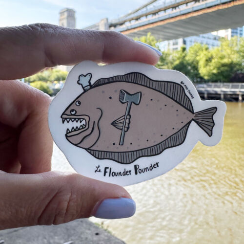 Inspired by one of my most beloved newish hobbies Fishing down the shore, and with the help of my boyfriend this flounder collection was born! Our stickers are waterproof, this one measures : 2.8 x 2 inches.
